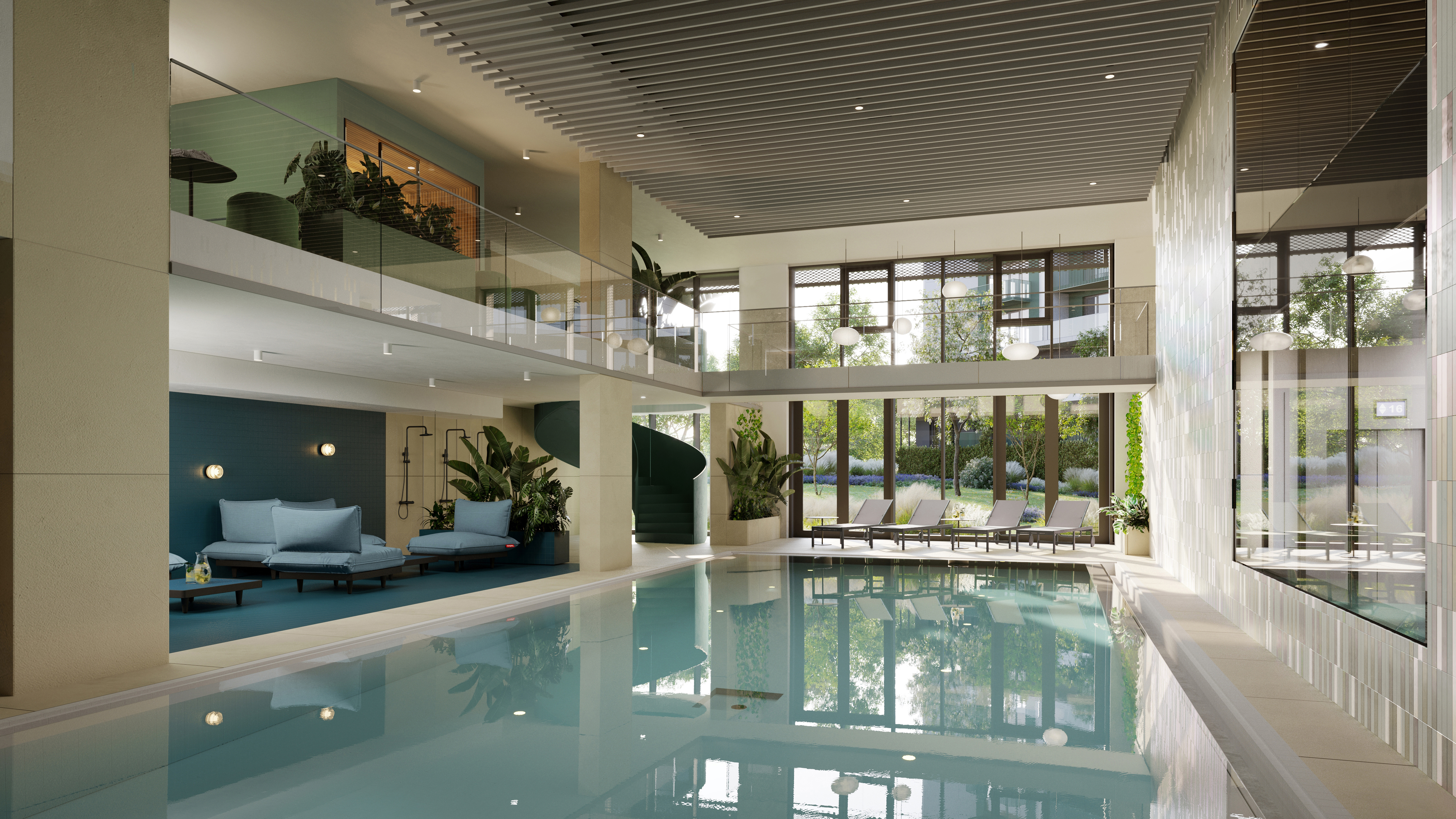 Community spaces—such as a two-level wellness complex with a swimming pool, a shared lounge, a fitness center, and a co-working office—offer services that make everyday life more comfortable.